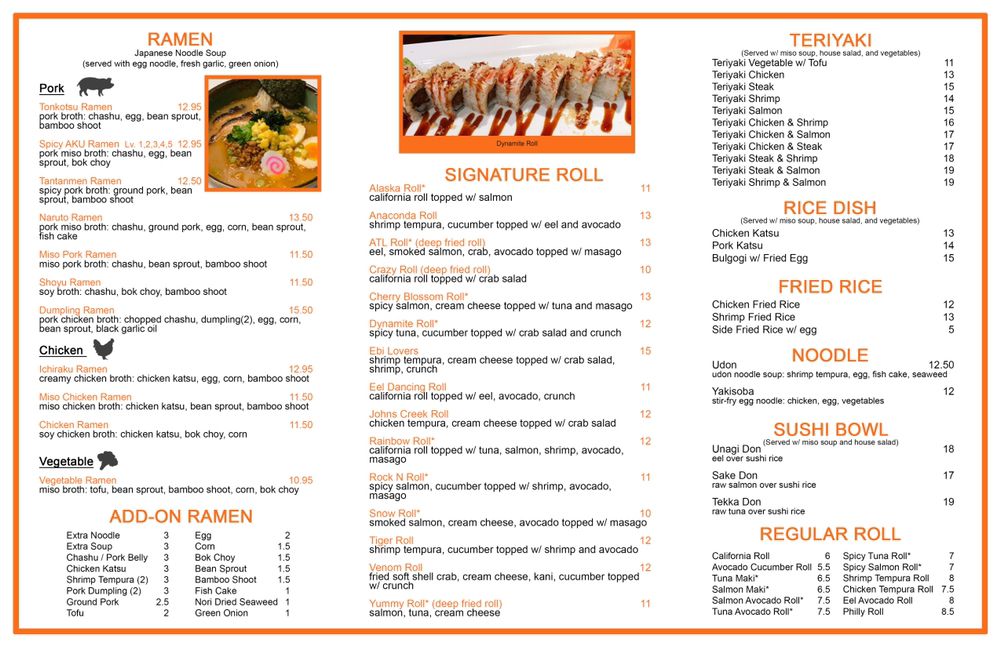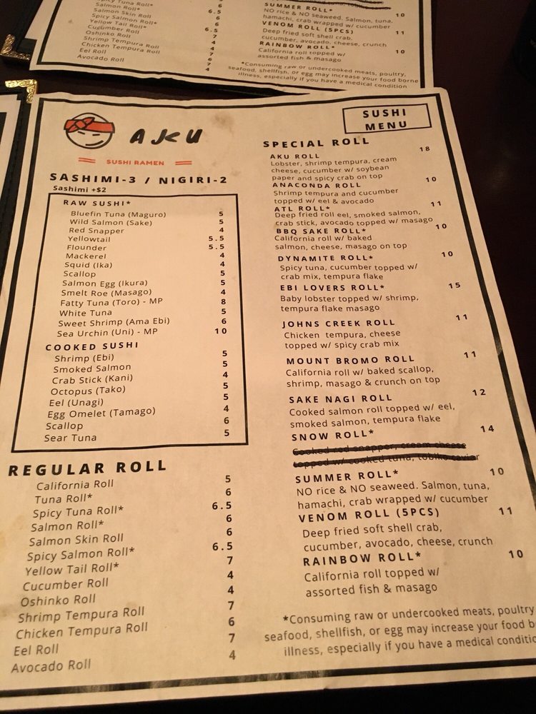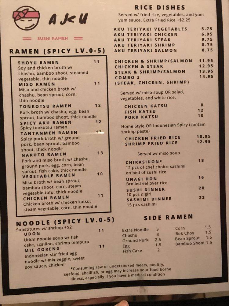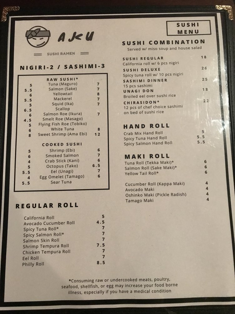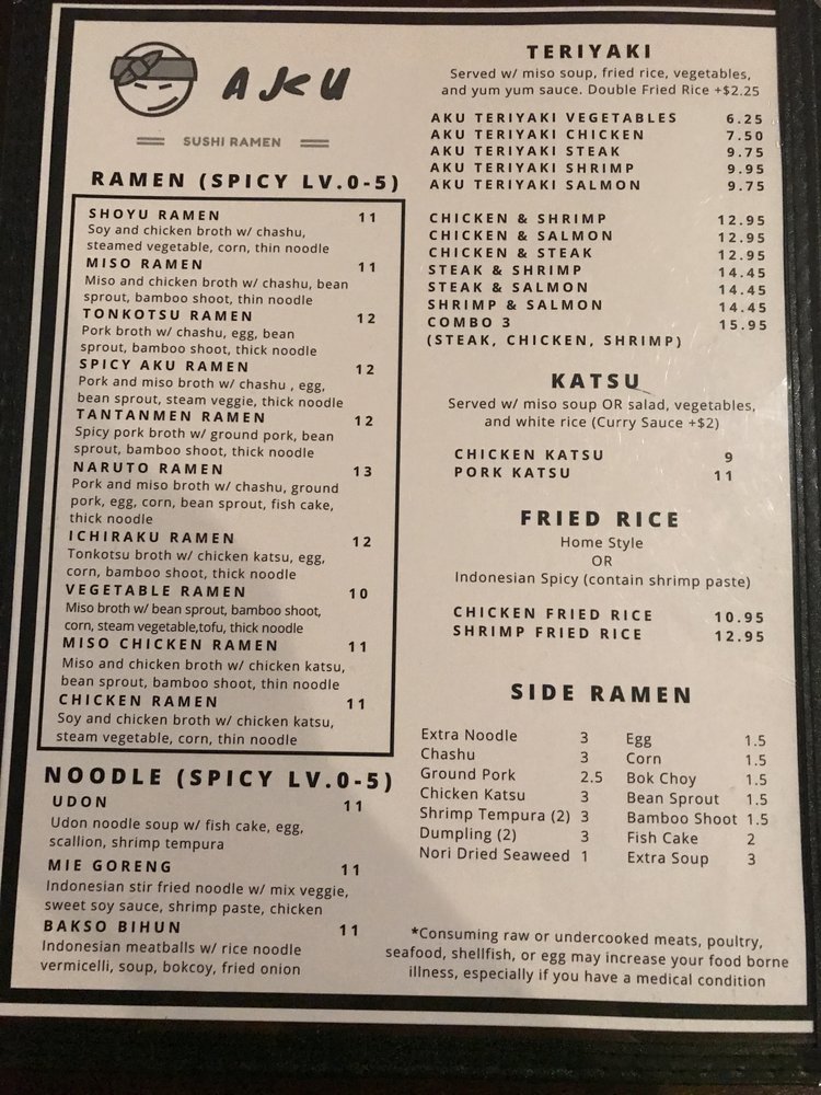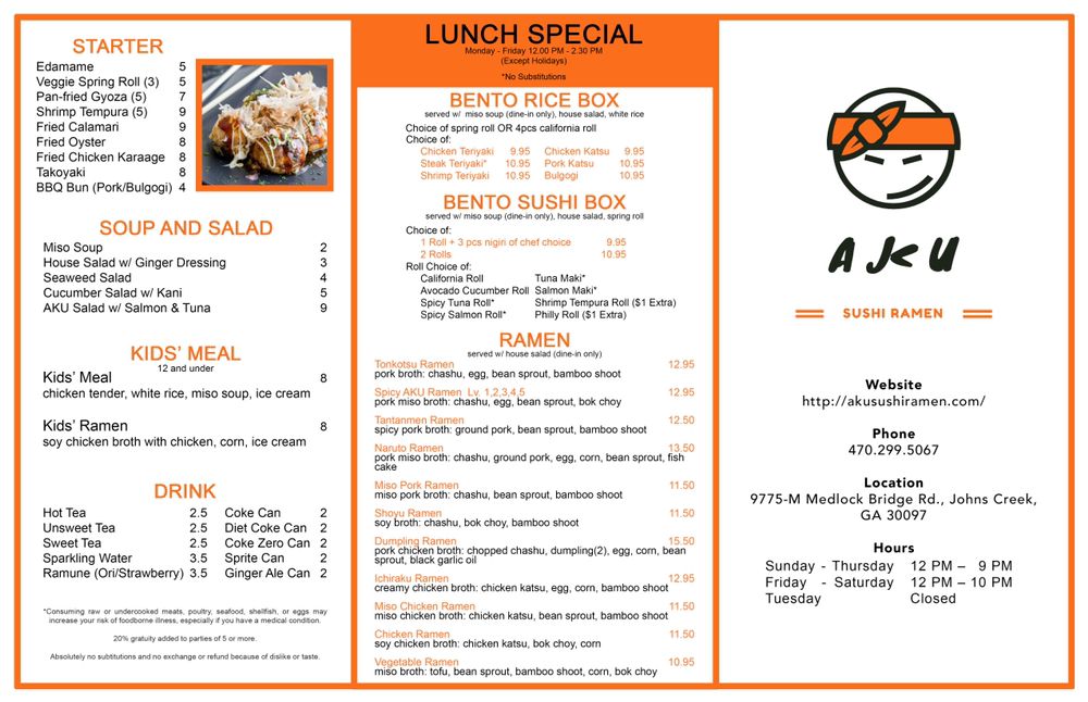 AKU Sushi Ramen, located in Johns Creek, GA, offers a delightful fusion of Japanese flavors with a variety of ramen and sushi options. The menu includes traditional ramen dishes like Shoyu, Miso, and Tonkatsu, as well as spicy options such as Spicy Aku Ramen and Tantanmen Ramen. The Lunch Combos and Sushi Lunch offerings provide a well-rounded dining experience. Customers rave about the quality of the food, with one mentioning the perfectly packaged delivery and another praising the fresh sushi and flavorful ramen. The casual and intimate atmosphere, along with attentive service, makes it a great spot for a meal with friends or family. Whether you're a ramen enthusiast or a sushi lover, AKU Sushi Ramen promises a unique and satisfying culinary experience.